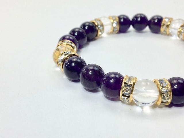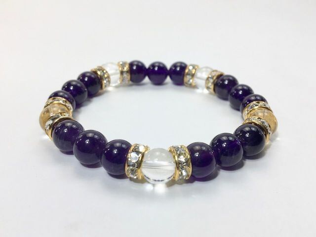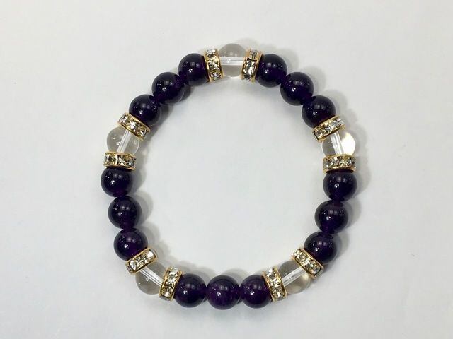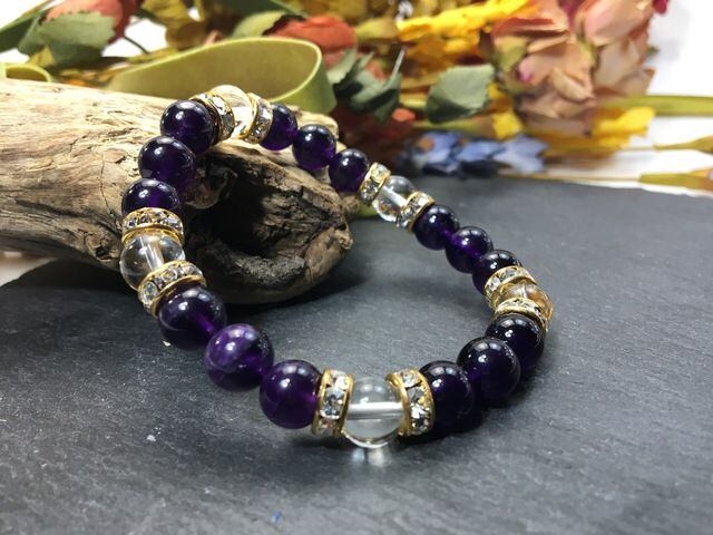 こちらは、8mm玉のアメジストと水晶を使ったパワーストーンブレスレットです。シンプルなデザインでどんなコーディネートにも合わせやすいデザインに仕上げています。サイズは内周約15cmです。気になる方は是非この機会にどうぞ。
