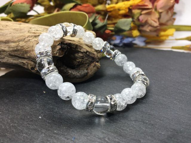 こちらは、8mm玉のクラック水晶と水晶を使ったパワーストーンブレスレットです。シンプルなデザインでどんなコーディネートにも合わせやすいデザインに仕上げています。サイズは内周約15cmです。気になる方は是非この機会にどうぞ。