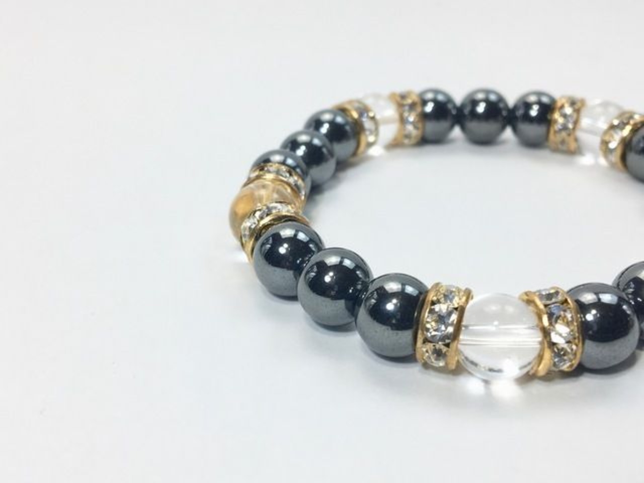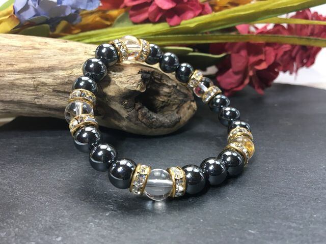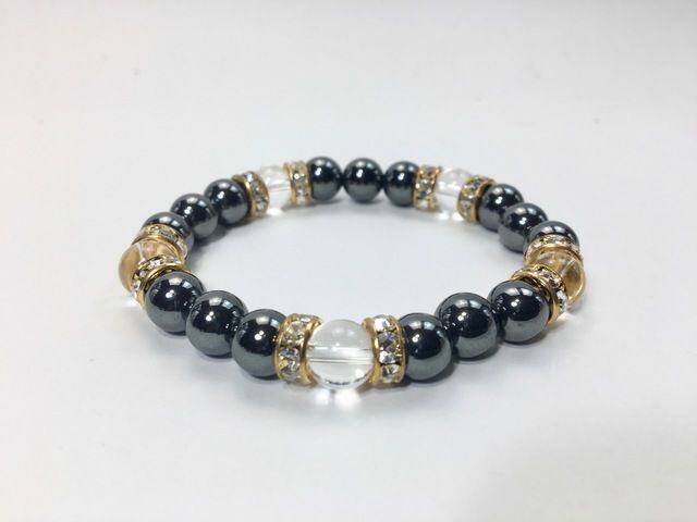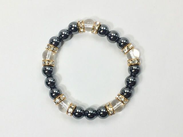 こちらは、8mm玉のヘマタイトと水晶を使ったパワーストーンブレスレットです。シンプルなデザインでどんなコーディネートにも合わせやすいデザインに仕上げています。サイズは内周約15cmです。気になる方は是非この機会にどうぞ。