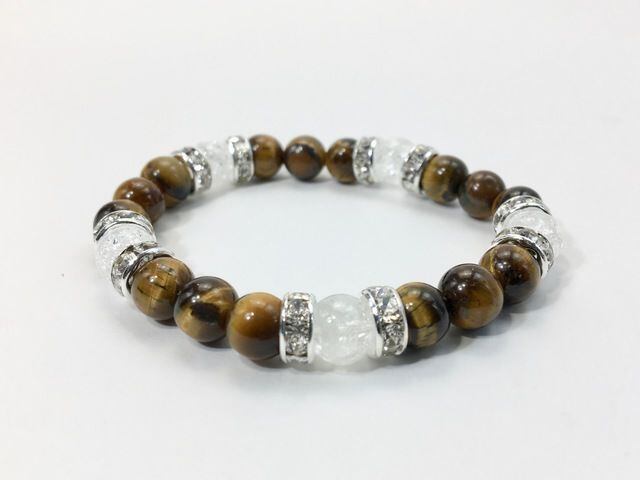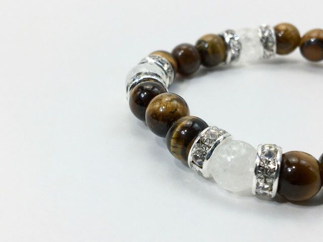 こちらは、8mm玉のタイガーアイとクラック水晶を使ったパワーストーンブレスレットです。シンプルなデザインでどんなコーディネートにも合わせやすいデザインに仕上げています。サイズは内周約15cmです。気になる方は是非この機会にどうぞ。