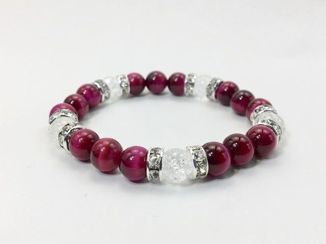 こちらは、8mm玉のピンクタイガーアイとクラック水晶を使ったパワーストーンブレスレットです。シンプルなデザインでどんなコーディネートにも合わせやすいデザインに仕上げています。サイズは内周約15cmです。気になる方は是非この機会にどうぞ。
