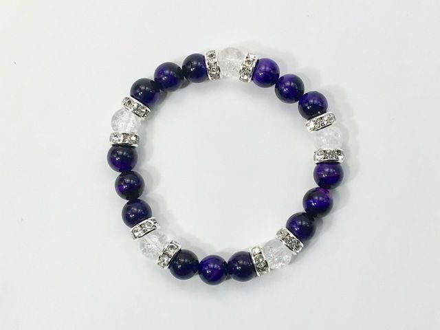 こちらは、8mm玉のパープルタイガーアイとクラック水晶を使ったパワーストーンブレスレットです。シンプルなデザインでどんなコーディネートにも合わせやすいデザインに仕上げています。サイズは内周約15cmです。気になる方は是非この機会にどうぞ。
