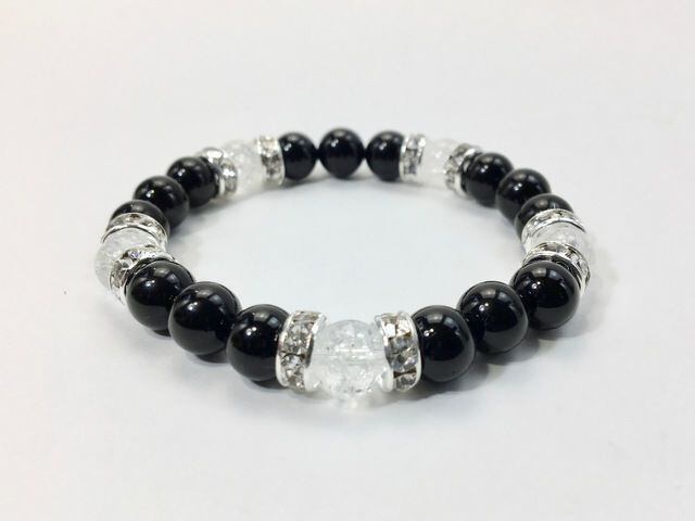 こちらは、8mm玉のオニキスとクラック水晶を使ったパワーストーンブレスレットです。シンプルなデザインでどんなコーディネートにも合わせやすいデザインに仕上げています。サイズは内周約15cmです。気になる方は是非この機会にどうぞ。