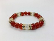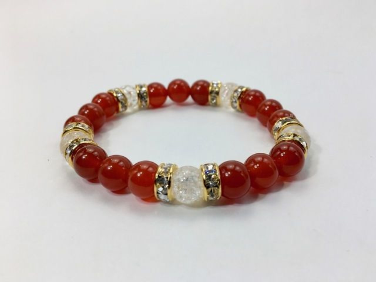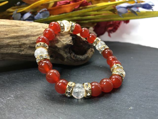 こちらは、8mm玉の赤瑪瑙とクラック水晶を使ったパワーストーンブレスレットです。シンプルなデザインでどんなコーディネートにも合わせやすいデザインに仕上げています。サイズは内周約15cmです。気になる方は是非この機会にどうぞ。