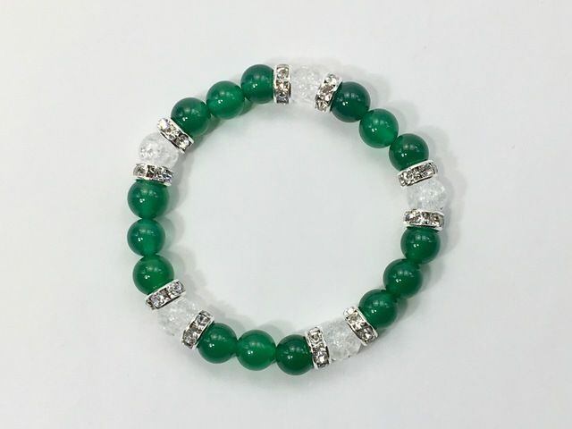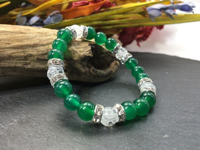 こちらは、8mm玉の緑瑪瑙とクラック水晶を使ったパワーストーンブレスレットです。シンプルなデザインでどんなコーディネートにも合わせやすいデザインに仕上げています。サイズは内周約15cmです。気になる方は是非この機会にどうぞ。