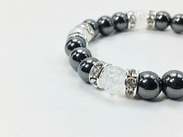 こちらは、8mm玉のヘマタイトとクラック水晶を使ったパワーストーンブレスレットです。シンプルなデザインでどんなコーディネートにも合わせやすいデザインに仕上げています。サイズは内周約15cmです。気になる方は是非この機会にどうぞ。