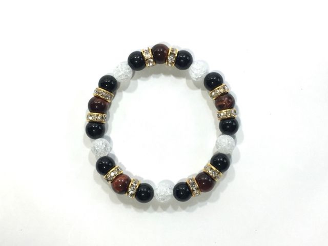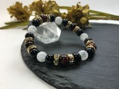 こちらは、8mm玉のレッドタイガーアイとオニキス、クラック水晶を組み合わせたパワーストーンブレスレットです。今回は五芒星デザインで石を配置しております。五芒星とは、陰陽道の基本概念となった陰陽五行説、木・火・土・金・水の5つの元素の働きの相克を表したものであり、五芒星は厄除・開運を願うデザインと重宝されているデザインです。サイズは内周約15cmです。気になる方は是非この機会にどうぞ。