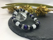 こちらは、8mm玉のパープルタイガーアイとオニキス、クラック水晶を組み合わせたパワーストーンブレスレットです。今回は五芒星デザインで石を配置しております。五芒星とは、陰陽道の基本概念となった陰陽五行説、木・火・土・金・水の5つの元素の働きの相克を表したものであり、五芒星は厄除・開運を願うデザインと重宝されているデザインです。サイズは内周約15cmです。気になる方は是非この機会にどうぞ。