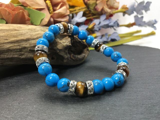 こちらは、8mm玉のターコイズとタイガーアイを使ったパワーストーンブレスレットです。シンプルなデザインでどんなコーディネートにも合わせやすいデザインに仕上げています。サイズは内径約15cmです。気になる方は是非この機会にどうぞ。