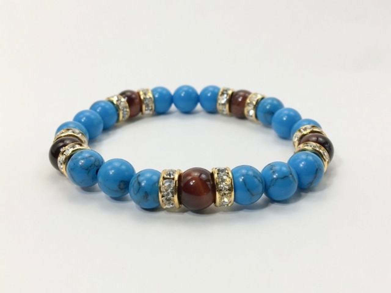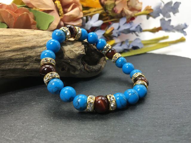 こちらは、8mm玉のターコイズとレッドタイガーアイを使ったパワーストーンブレスレットです。シンプルなデザインでどんなコーディネートにも合わせやすいデザインに仕上げています。サイズは内径約15cmです。気になる方は是非この機会にどうぞ。