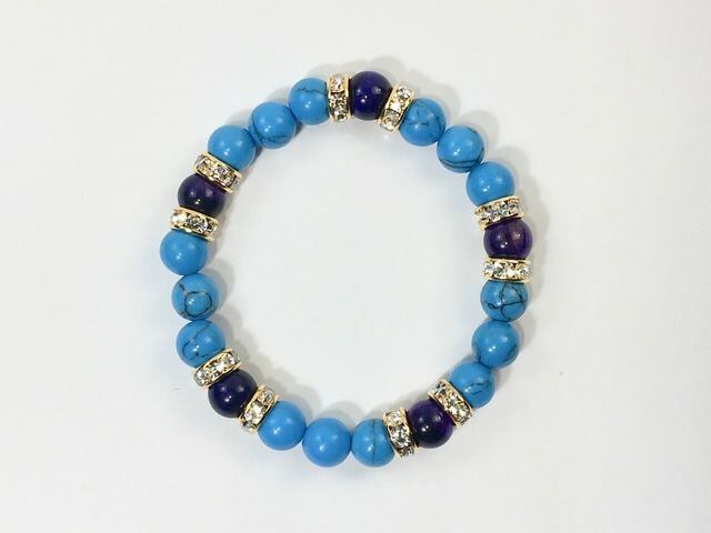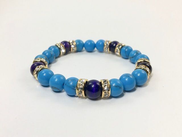 こちらは、8mm玉のターコイズとパープルタイガーアイを使ったパワーストーンブレスレットです。シンプルなデザインでどんなコーディネートにも合わせやすいデザインに仕上げています。サイズは内径約15cmです。気になる方は是非この機会にどうぞ。