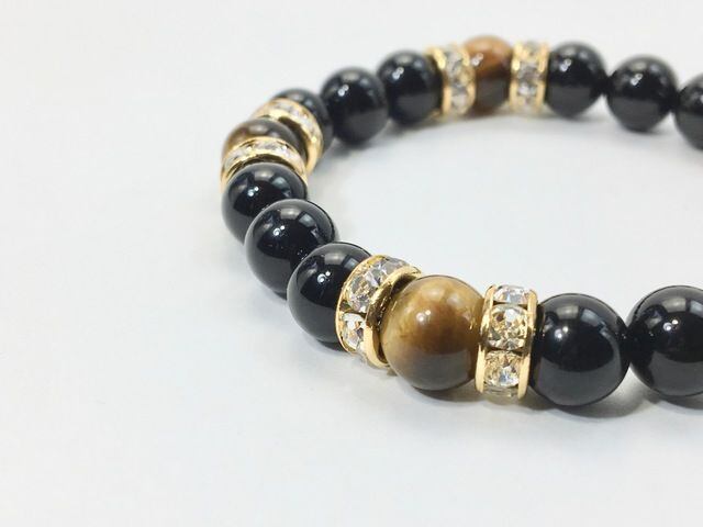 こちらは、8mm玉のオニキスとタイガーアイを使ったパワーストーンブレスレットです。シンプルなデザインでどんなコーディネートにも合わせやすいデザインに仕上げています。サイズは内周約15cmです。気になる方は是非この機会にどうぞ。
