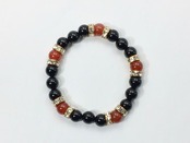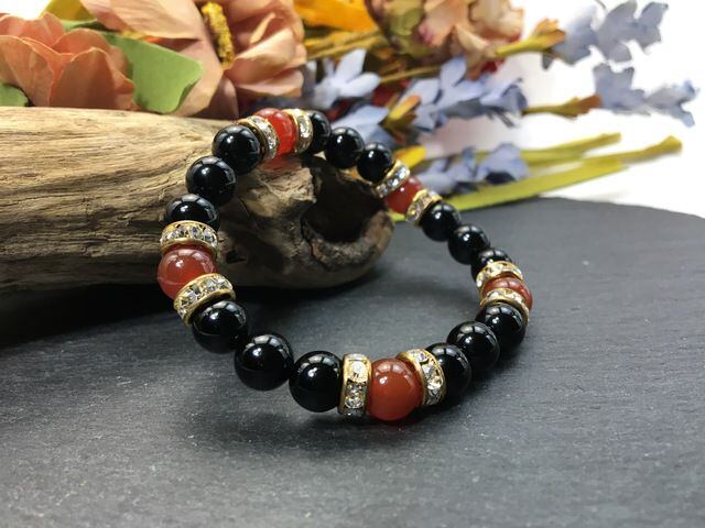 こちらは、8mm玉のオニキスと赤瑪瑙を使ったパワーストーンブレスレットです。シンプルなデザインでどんなコーディネートにも合わせやすいデザインに仕上げています。サイズは内周約15cmです。気になる方は是非この機会にどうぞ。