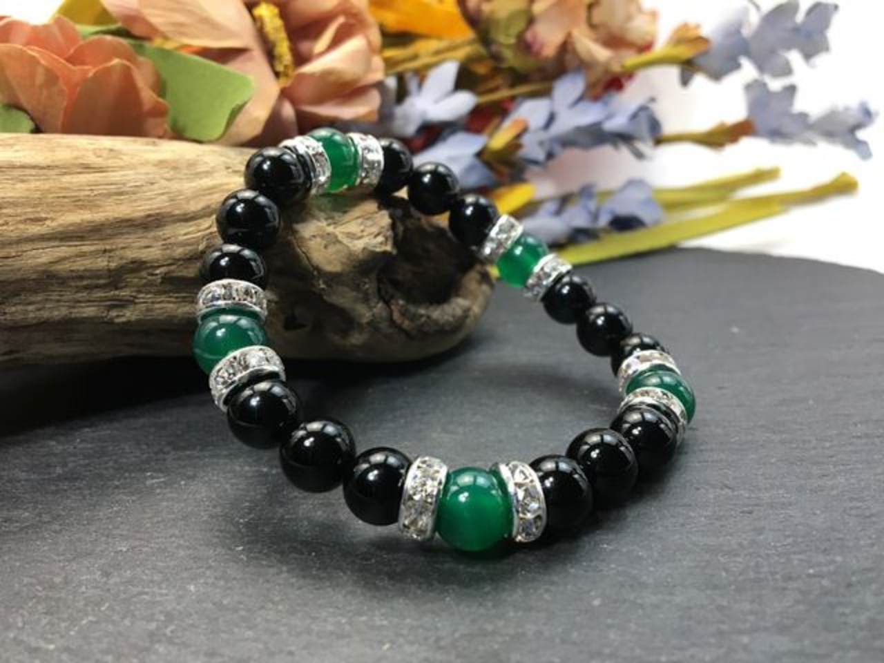 こちらは、8mm玉のオニキスと緑瑪瑙を使用した天然石ブレスレットです。間にはロンデルを挟み高級感ある仕上がりです。石大きさは腕にも馴染みやすいように8mm玉で内周約15cm(伸可能)です。気になる方は是非この機会にどうぞ。
