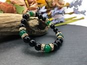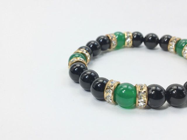 こちらは、8mm玉のオニキスと緑瑪瑙を使用した天然石ブレスレットです。間にはロンデルを挟み高級感ある仕上がりです。石大きさは腕にも馴染みやすいように8mm玉で内周約15cm(伸可能)です。気になる方は是非この機会にどうぞ。