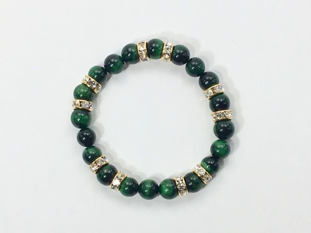 こちらは、8mm玉のグリーンタイガーアイを使ったパワーストーンブレスレットです。シンプルなデザインでどんなコーディネートにも合わせやすいデザインに仕上げています。サイズは内周約15cmです。気になる方は是非この機会にどうぞ。