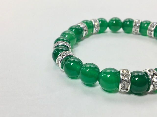 こちらは、8mm玉の緑瑪瑙を使ったパワーストーンブレスレットです。シンプルなデザインでどんなコーディネートにも合わせやすいデザインに仕上げています。サイズは内周約15cmです。気になる方は是非この機会にどうぞ。