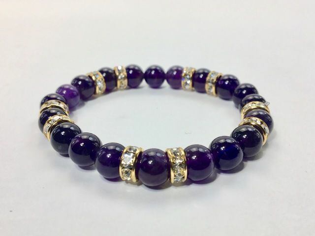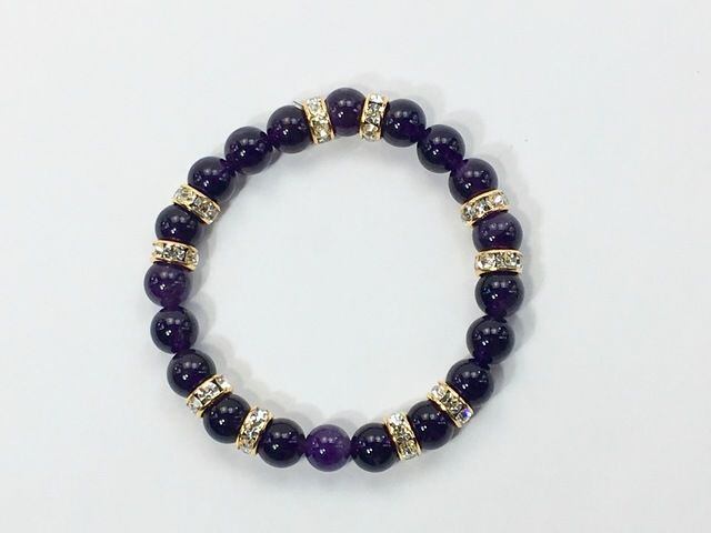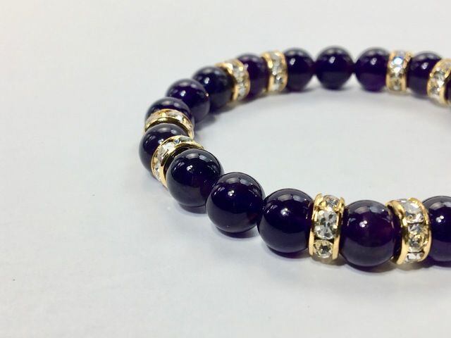 こちらは、8mm玉のアメジストを使ったパワーストーンブレスレットです。シンプルなデザインでどんなコーディネートにも合わせやすいデザインに仕上げています。サイズは内周約15cmです。気になる方は是非この機会にどうぞ。