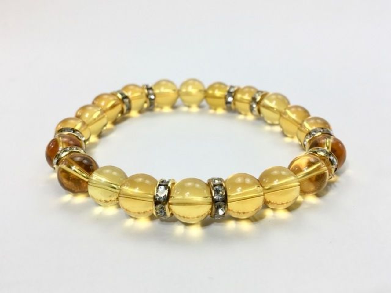 こちらは、8mm玉のシトリンを使ったパワーストーンブレスレットです。シンプルなデザインでどんなコーディネートにも合わせやすいデザインに仕上げています。サイズは内周約15cmです。気になる方は是非この機会にどうぞ。