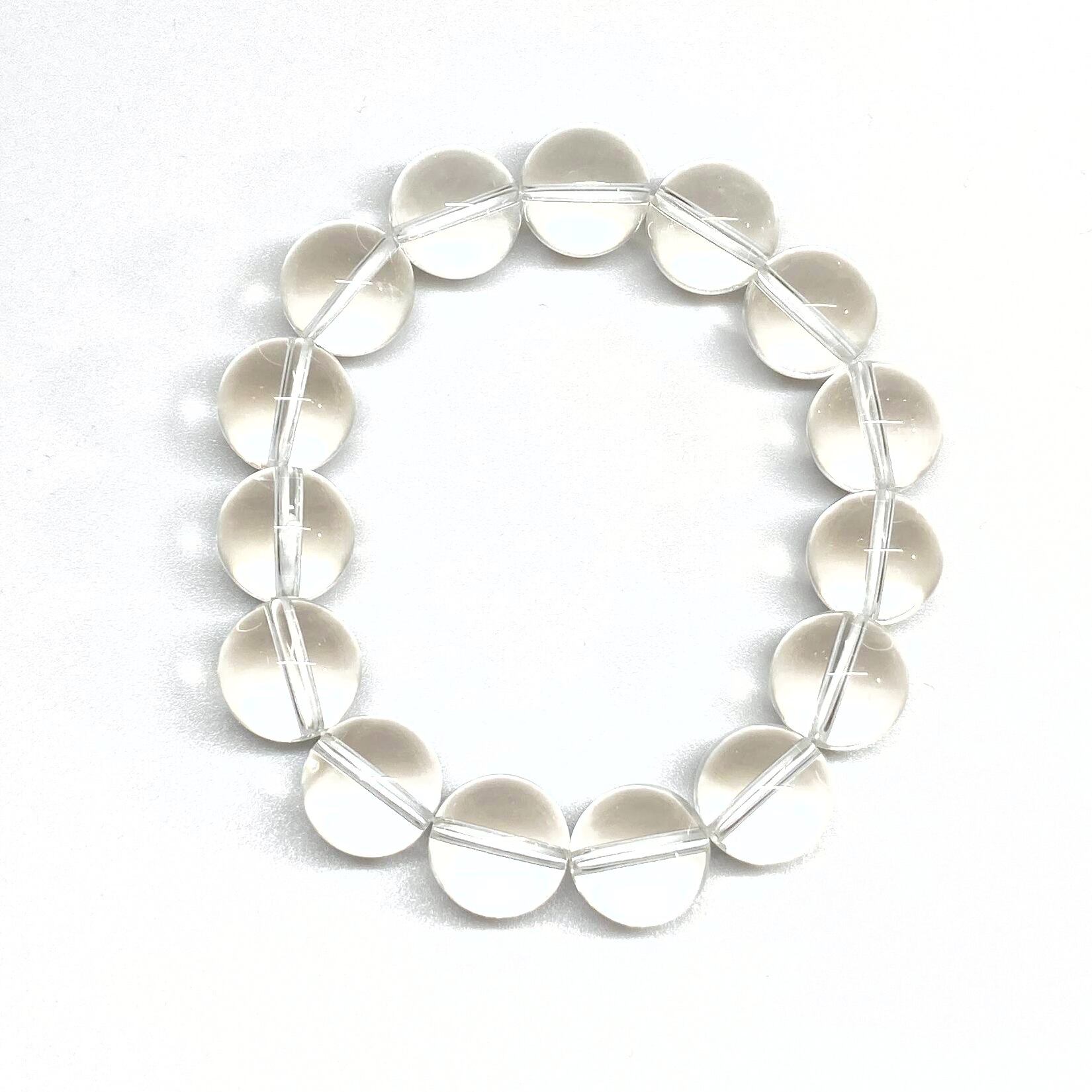 こちらは、14mm玉の水晶を使用した天然石ブレスレットです。シンプルなデザインですのでどんなコーディネートとも合わせ易いブレスレットです。石大きさはインパクトを与えてくれる大きさの14mm玉を使用しています。内周約17cmです。数に限りがございますので気になる方はお早めにどうぞ。