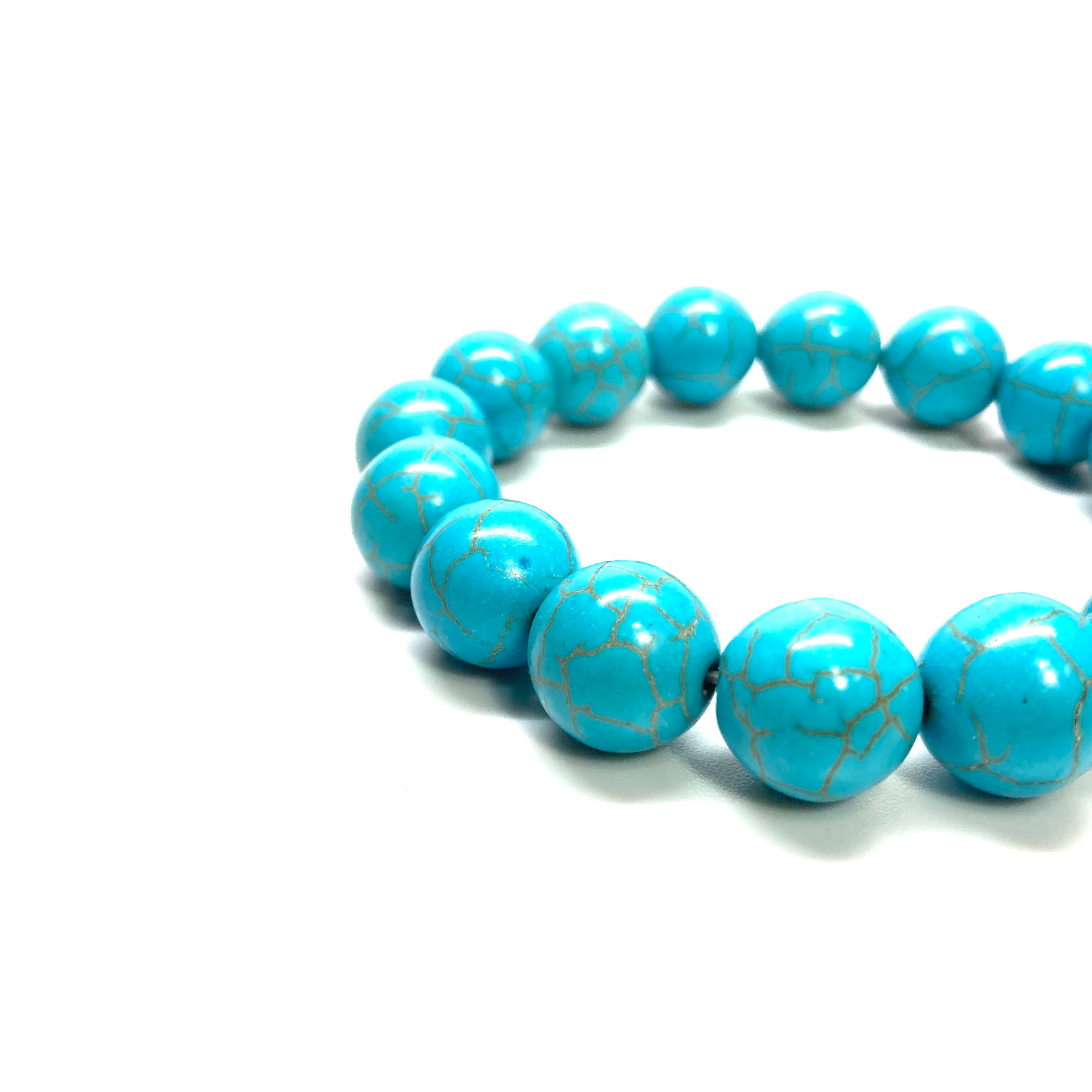 こちらは、14mm玉のターコイズを使用したブレスレットです。シンプルなデザインですのでどんなコーディネートとも合わせ易いブレスレットです。石大きさはインパクトを与えてくれる大きさの14mm玉を使用しています。内周約17cmです。数に限りがございますので気になる方はお早めにどうぞ。