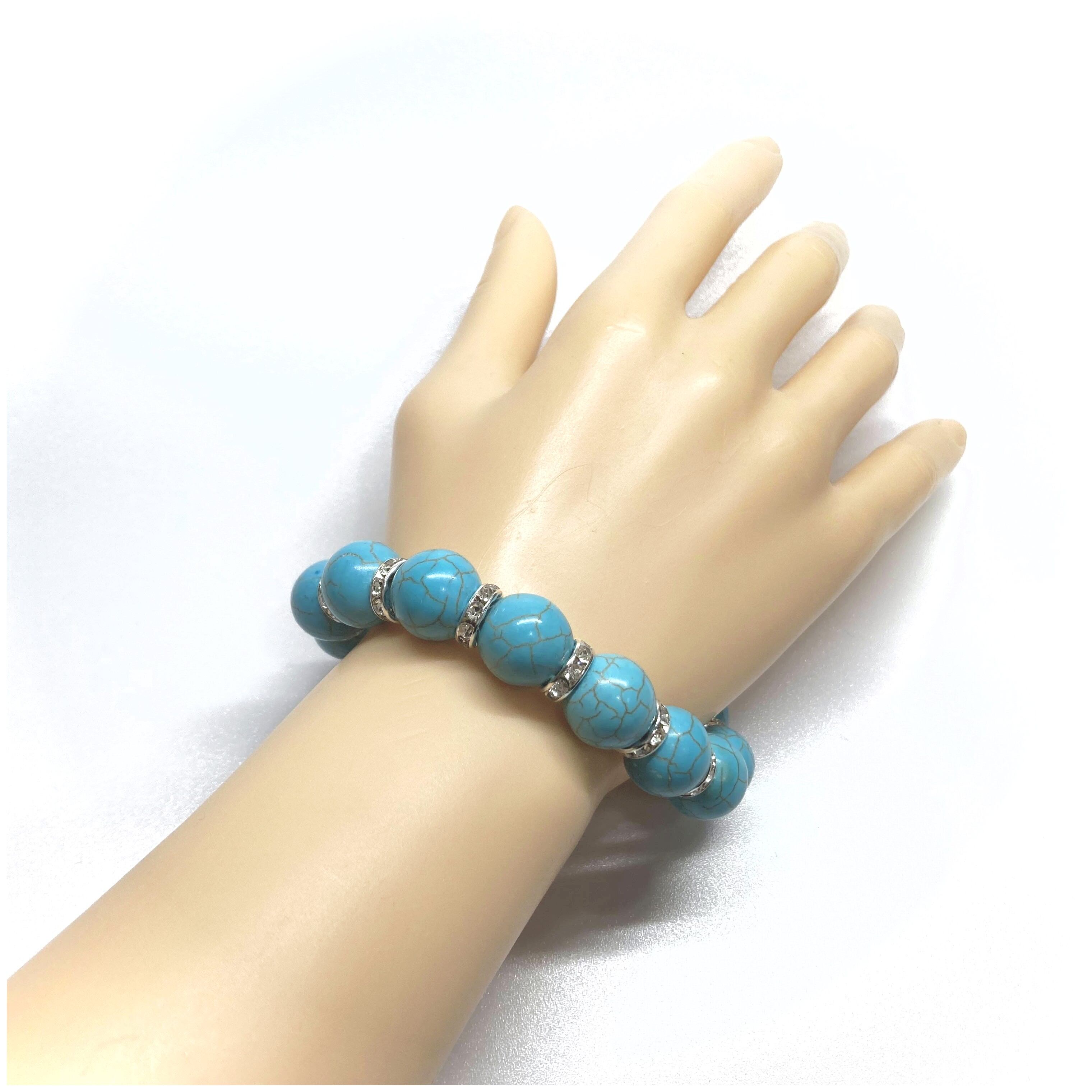 こちらは、14mm玉のターコイズを使用したブレスレットです。シンプルなデザインですのでどんなコーディネートとも合わせ易いブレスレットです。石との間にはロンデルを挟み高級感を演出しています。石大きさはインパクトを与えてくれる大きさの14mm玉を使用しています。内周約17cmです。数に限りがございますので気になる方はお早めにどうぞ。