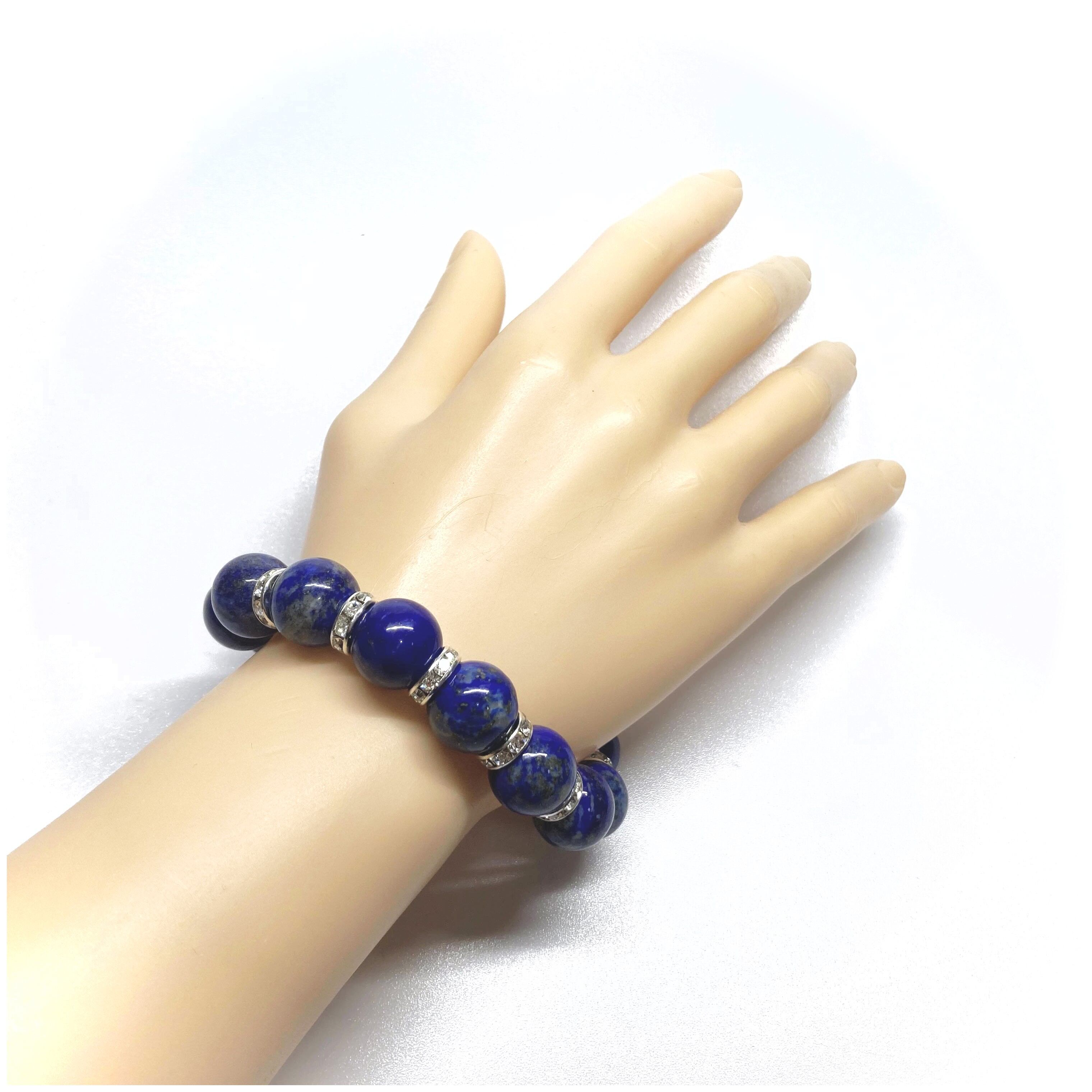 こちらは、14mm玉のラピスラズリを使用した天然石ブレスレットです。シンプルなデザインですのでどんなコーディネートとも合わせ易いブレスレットです。石との間にはロンデルを挟み高級感を演出しています。石大きさはインパクトを与えてくれる大きさの14mm玉を使用しています。内周約17cmです。数に限りがございますので気になる方はお早めにどうぞ。