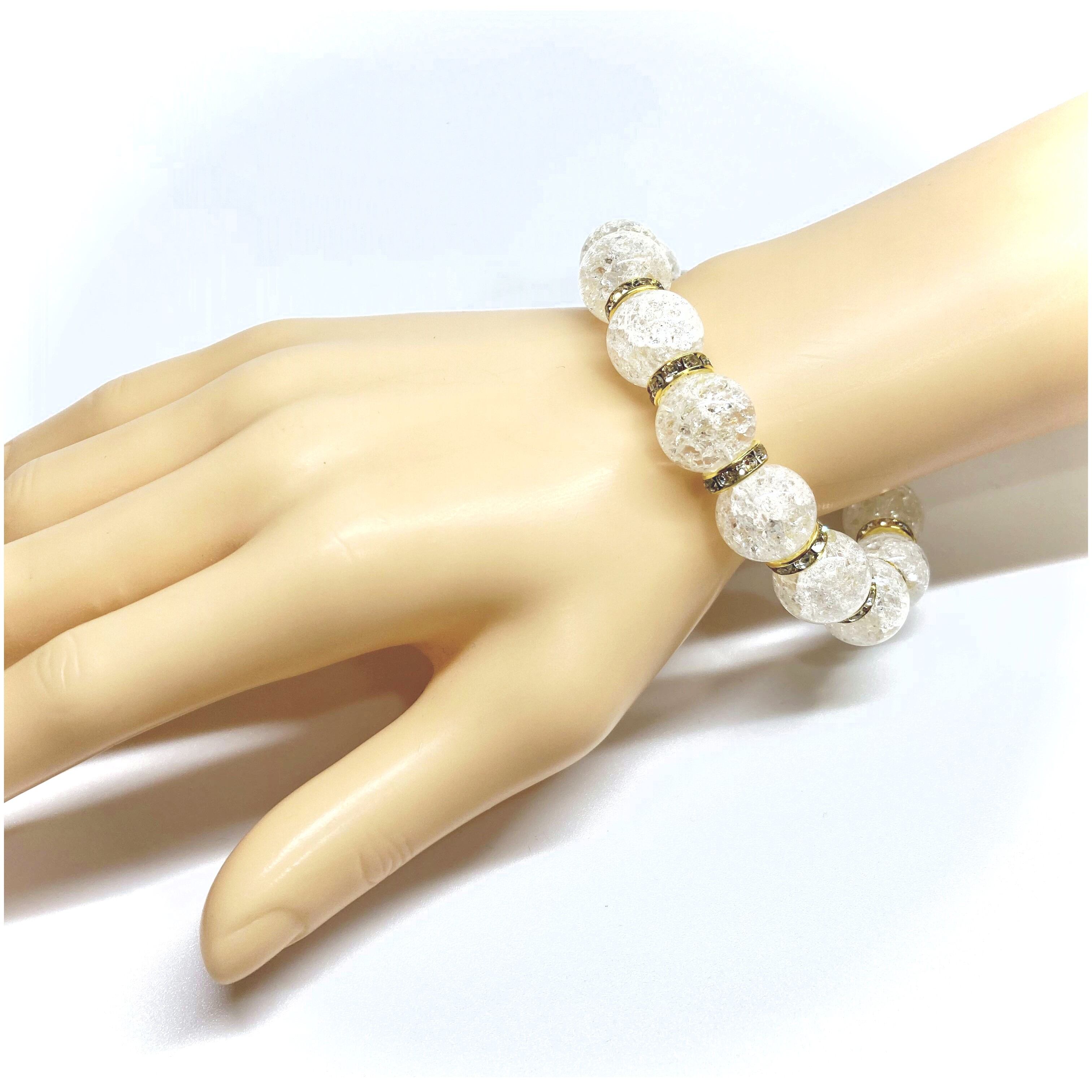 こちらは、14mm玉のクラック水晶を使用した天然石ブレスレットです。シンプルなデザインですのでどんなコーディネートとも合わせ易いブレスレットです。石との間にはロンデルを挟み高級感を演出しています。石大きさはインパクトを与えてくれる大きさの14mm玉を使用しています。内周約17cmです。数に限りがございますので気になる方はお早めにどうぞ。
