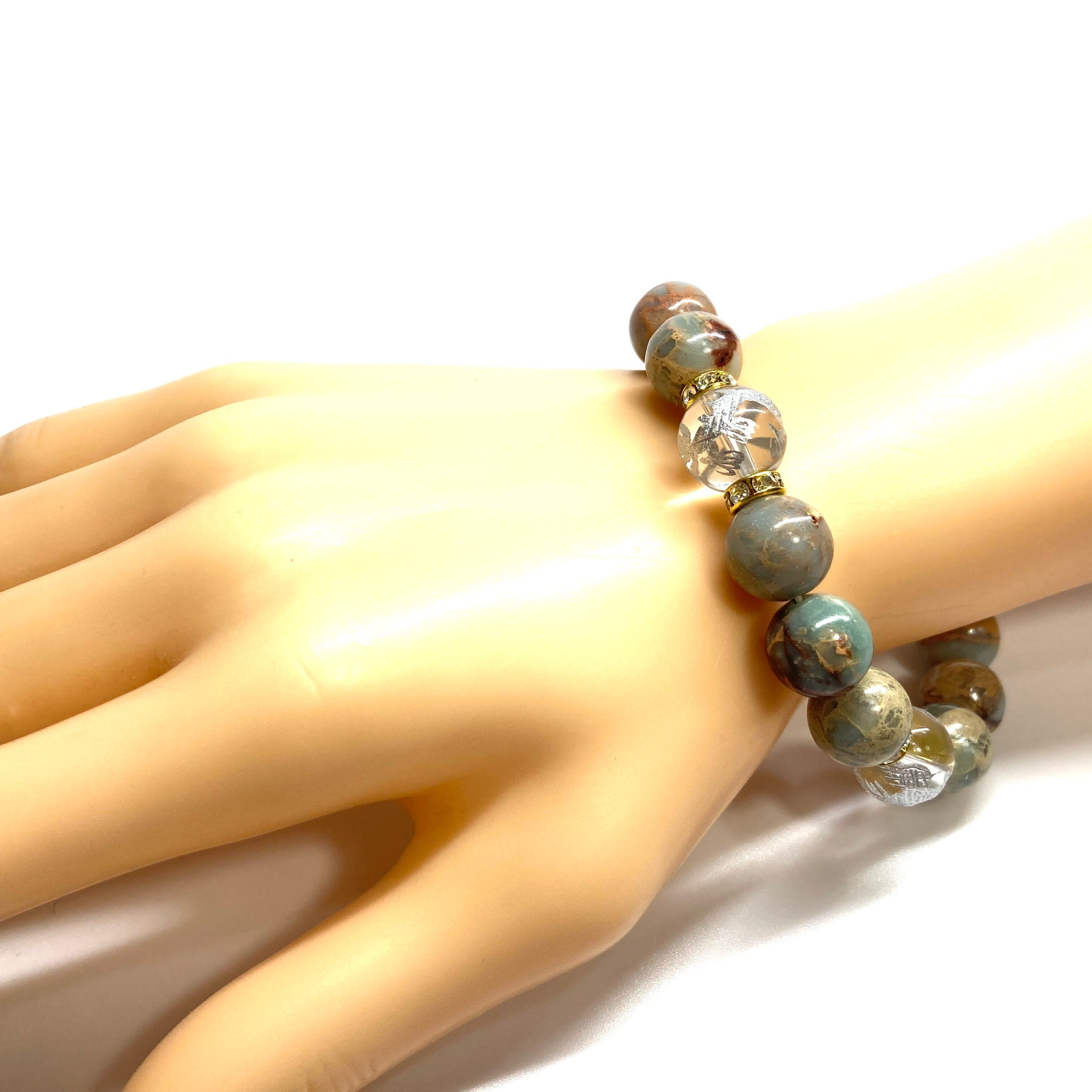 12mm 四神獣銀彫水晶×インプレッションストーン パワーストーン ブレスレット天然石 運気上昇 開運 ☆ お守り 青龍 白虎 玄武 朱雀 (ゴールド)メンズ・レディース 男性・女性 数珠ブレス 開運 ☆