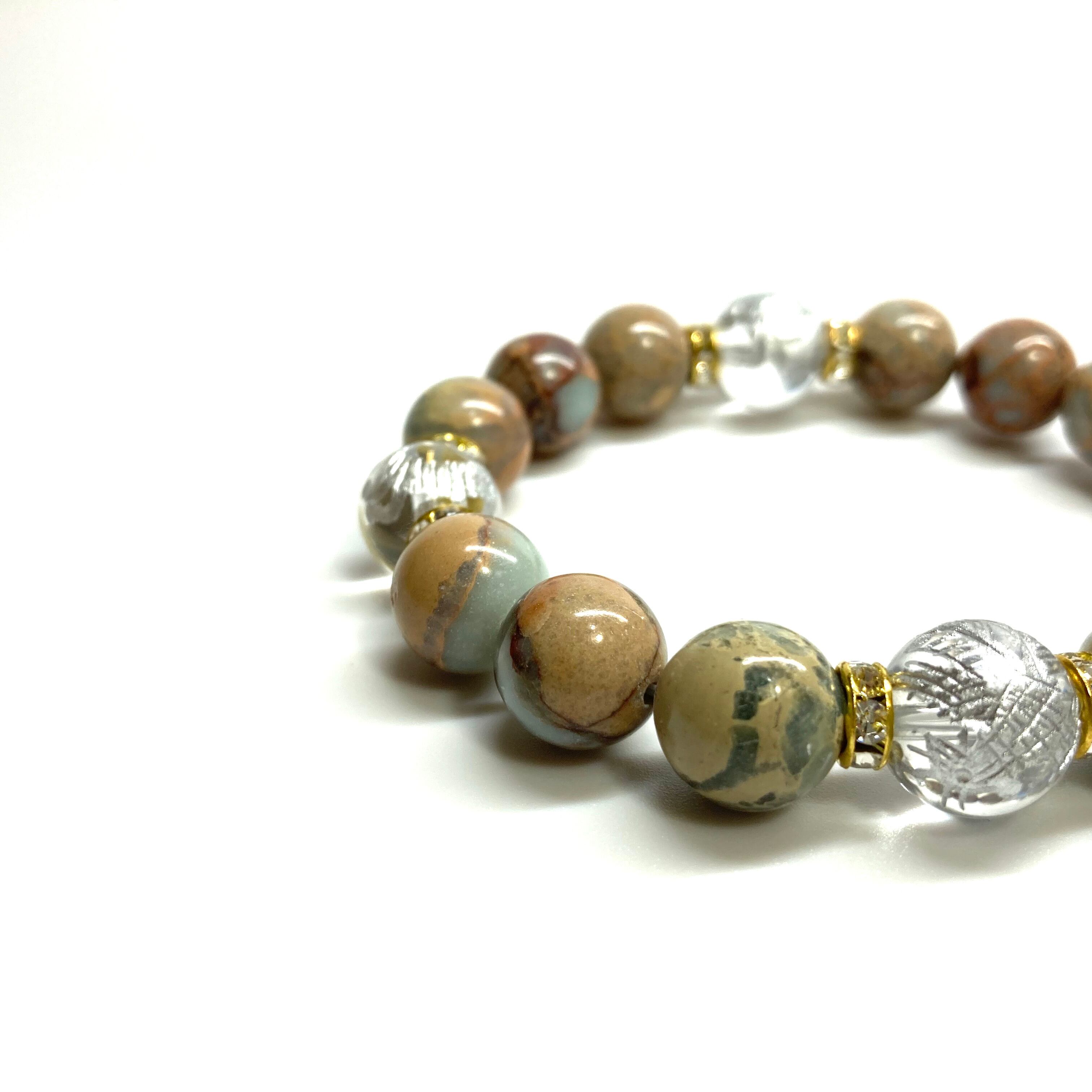 ご覧頂いているブレスレットは、四神獣銀彫水晶とインプレッションストーンを組み合わせたブレスレット。守り神である四神とパワーストーンの組み合わせで運気の流れを引き寄せる強運ブレスレットです。シンプルなデザインで男女問わず、年齢問わずご使用頂けるデザインなっております。シンプルなデザインは日常のアクセントとして、仕事やビジネスカジュアル、パーティーや特別なイベントなど様々なシーン活用できます。また、ちょっと贈り物にも最適なブレスレットになっております。四神獣を身につけて厄災から身を守り、多くの運気を呼び込まれてください。