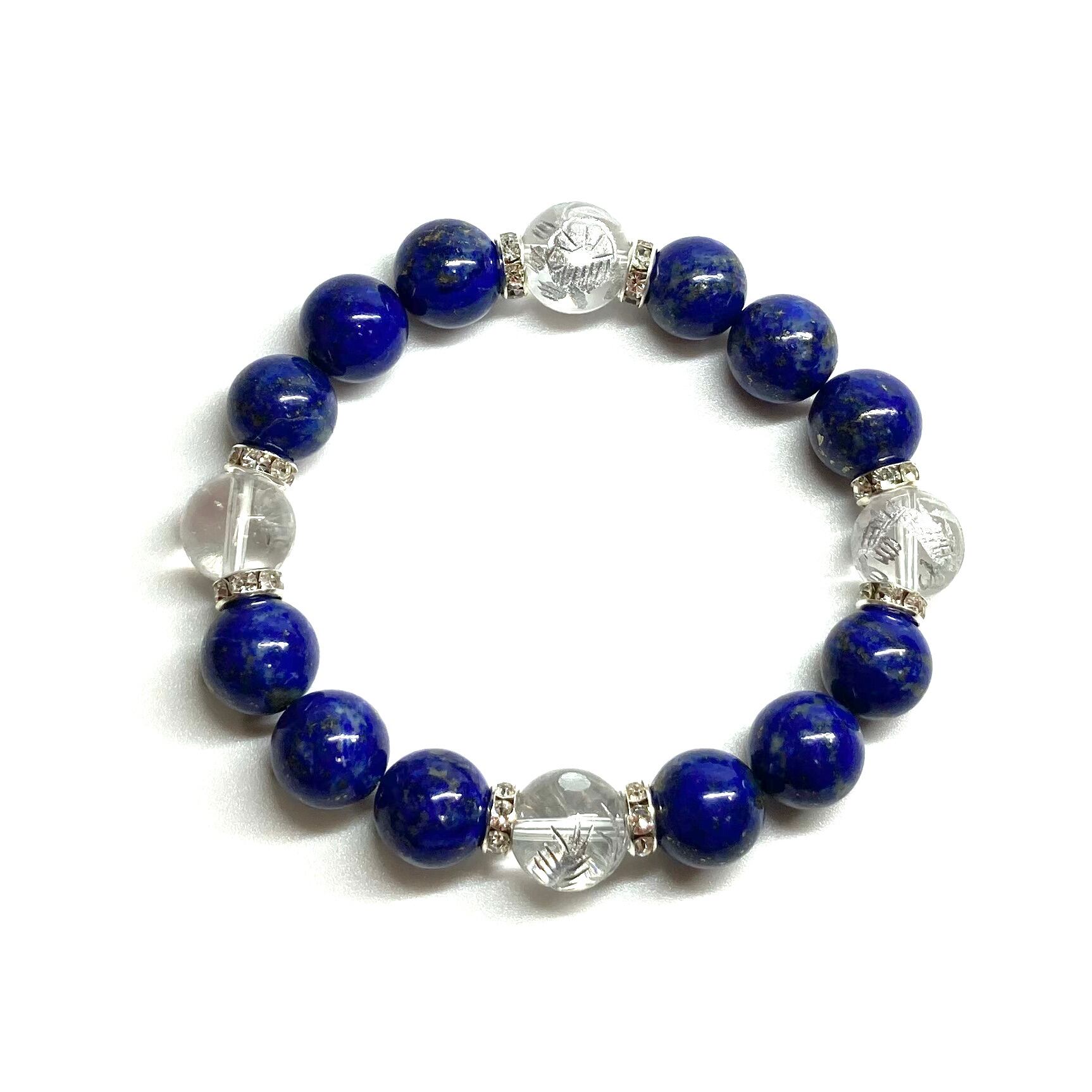 12mm 四神獣銀彫水晶×ラピスラズリ パワーストーン ブレスレット天然石 開運 ☆ 厄払い お守り 青龍 白虎 玄武 朱雀 9月・12月誕生石 (シルバー)メンズ・レディース 男性・女性 数珠ブレス 開運 ☆