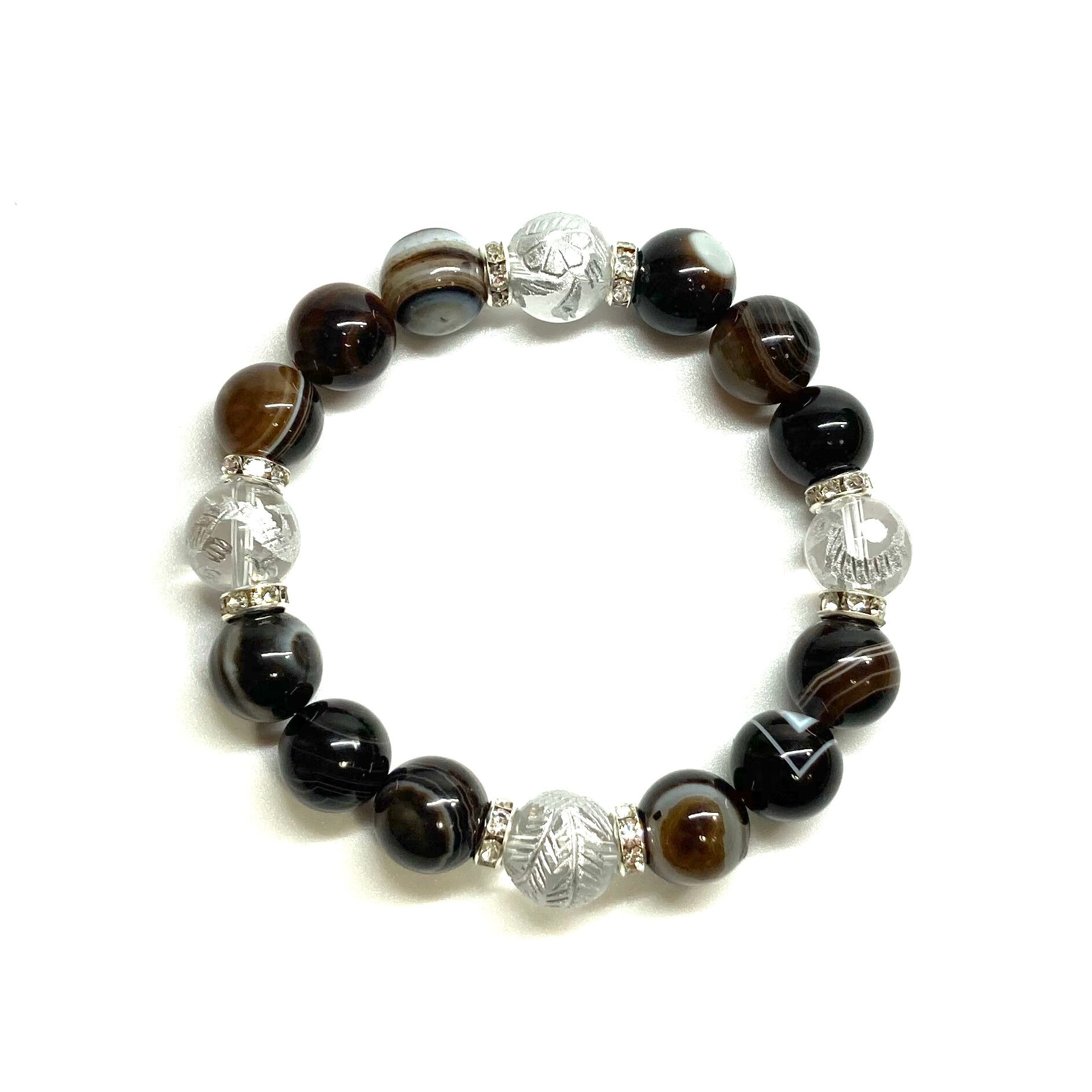 12mm 四神獣銀彫水晶×チベットアゲート(天眼石) パワーストーン ブレスレット天然石 運気上昇 金運 ギャンブル運 お守り (シルバー)メンズ・レディース 男性・女性 数珠ブレス 開運 ☆