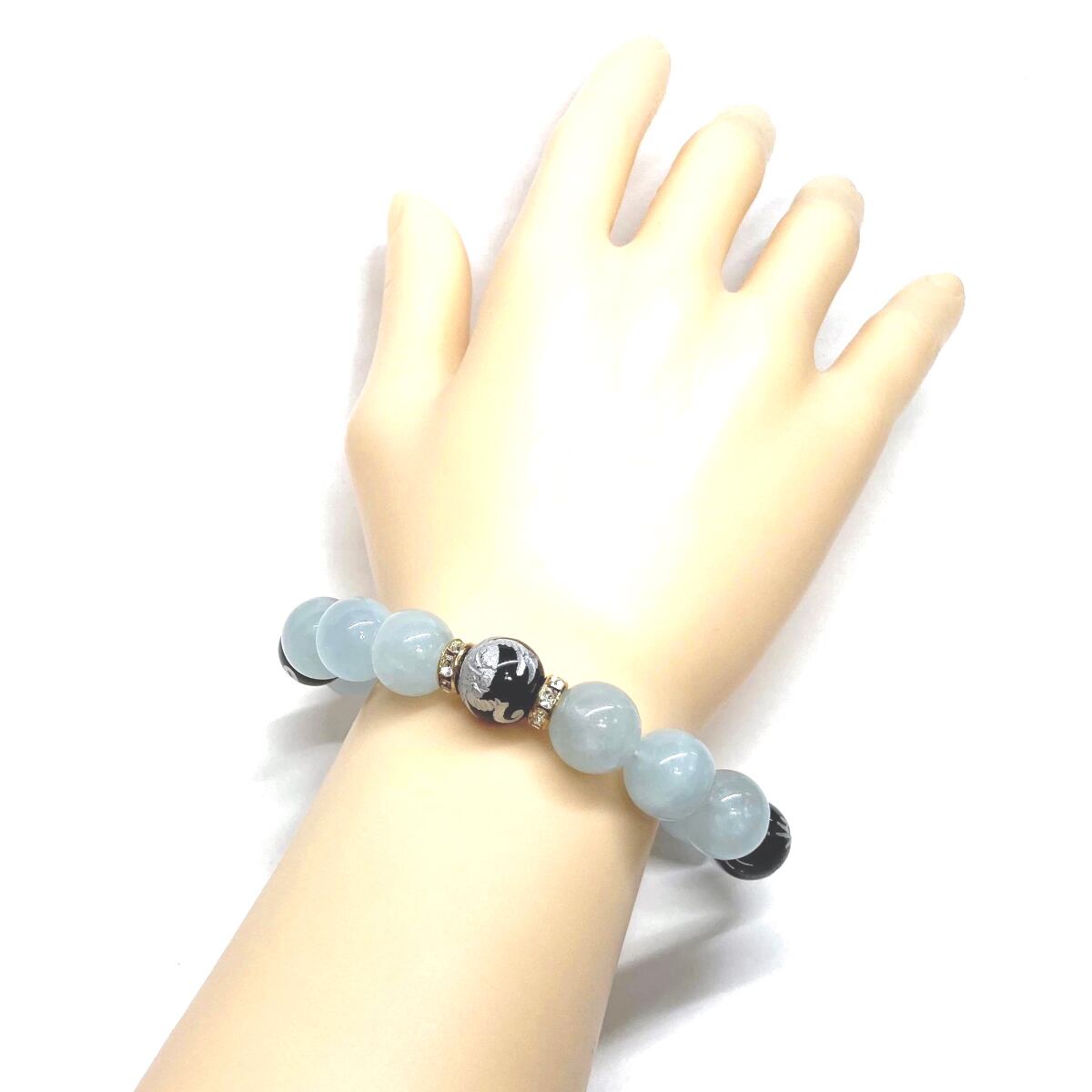 ご覧頂いているブレスレットは、四神獣銀彫オニキスとアクアマリンを組み合わせたブレスレット。守り神である四神とパワーストーンの組み合わせで運気の流れを引き寄せる強運ブレスレットです。シンプルなデザインで男女問わず、年齢問わずご使用頂けるデザインなっております。シンプルなデザインは日常のアクセントとして、仕事やビジネスカジュアル、パーティーや特別なイベントなど様々なシーン活用できます。また、ちょっと贈り物にも最適なブレスレットになっております。四神獣を身につけて厄災から身を守り、多くの運気を呼び込まれてください。