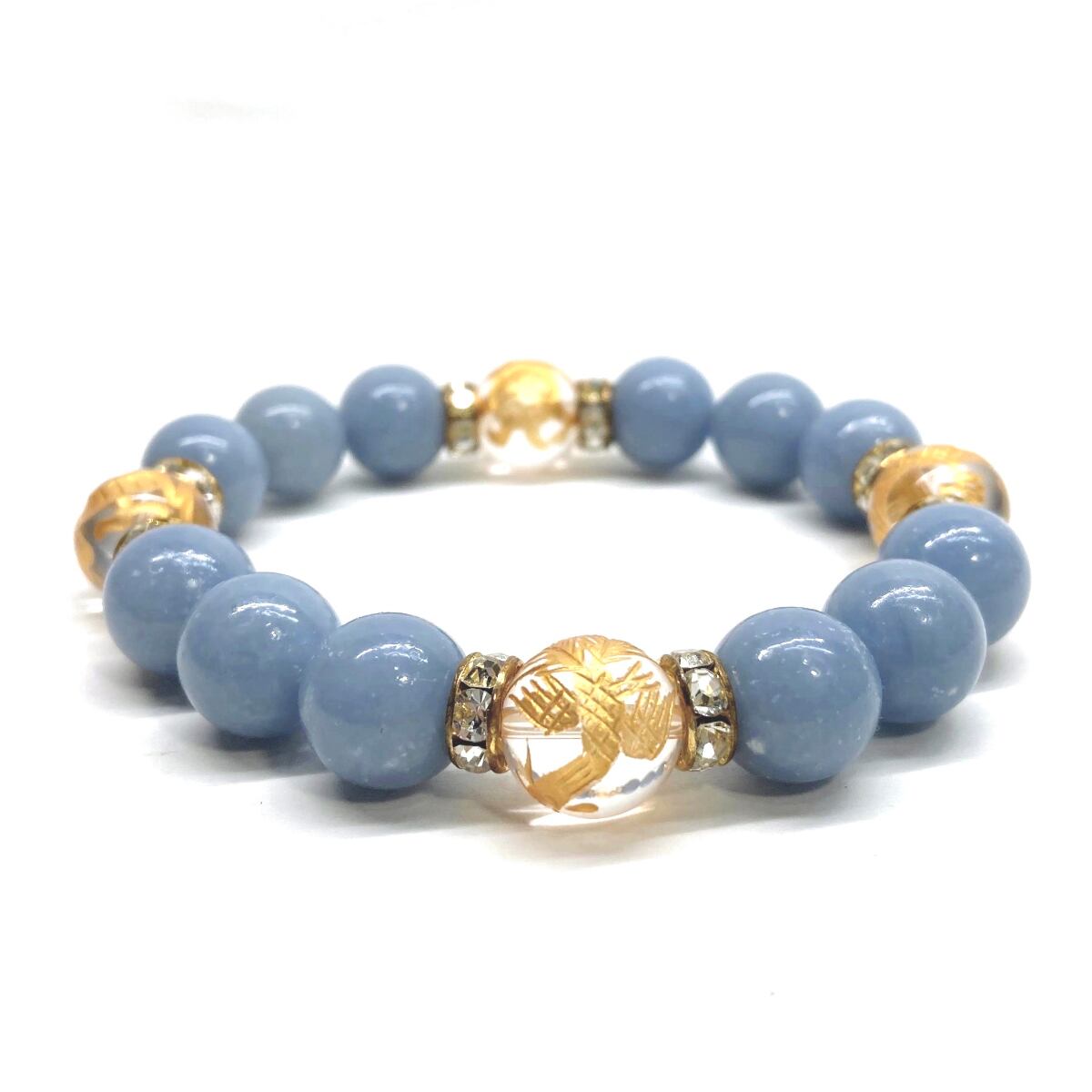 ご覧頂いているブレスレットは、四神獣金彫水晶とエンジェライトを組み合わせたブレスレット。守り神である四神とパワーストーンの組み合わせで運気の流れを引き寄せる強運ブレスレットです。シンプルなデザインで男女問わず、年齢問わずご使用頂けるデザインなっております。シンプルなデザインは日常のアクセントとして、仕事やビジネスカジュアル、パーティーや特別なイベントなど様々なシーン活用できます。また、ちょっと贈り物にも最適なブレスレットになっております。四神獣を身につけて厄災から身を守り、多くの運気を呼び込まれてください。