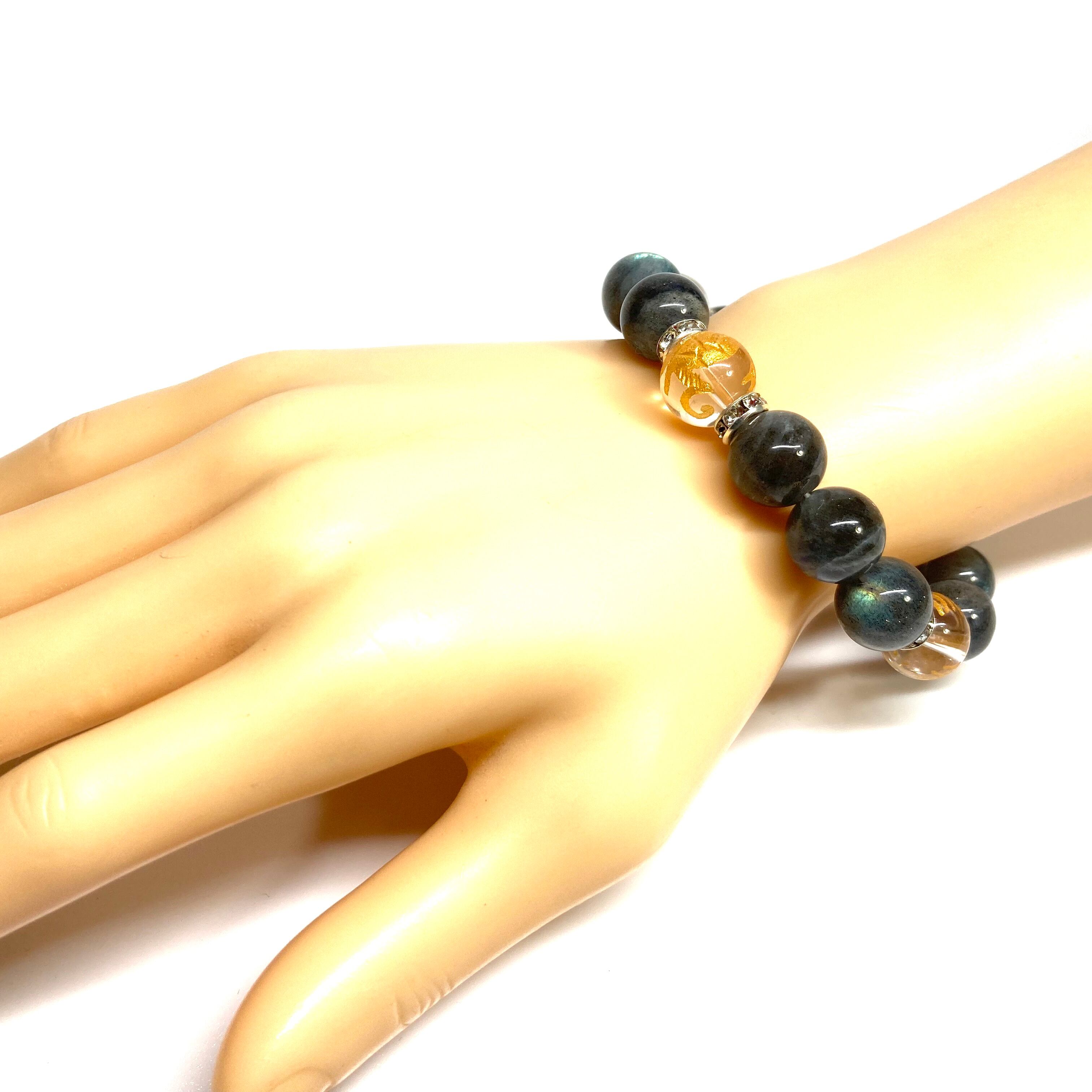 12mm 四神獣金彫水晶×ラブラドライト パワーストーン ブレスレット天然石 運気上昇 金運 ギャンブル運 お守り (シルバー)メンズ・レディース 男性・女性 数珠ブレス 開運 ☆
