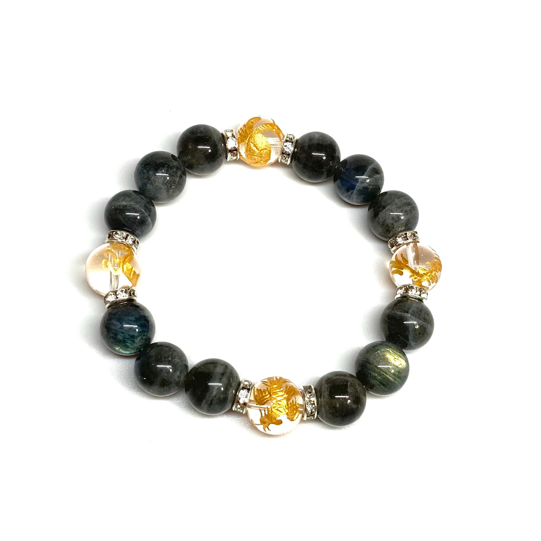 ご覧頂いているブレスレットは、四神獣金彫水晶とラブラドライト を組み合わせたブレスレット。守り神である四神とパワーストーンの組み合わせで運気の流れを引き寄せる強運ブレスレットです。シンプルなデザインで男女問わず、年齢問わずご使用頂けるデザインなっております。シンプルなデザインは日常のアクセントとして、仕事やビジネスカジュアル、パーティーや特別なイベントなど様々なシーン活用できます。また、ちょっと贈り物にも最適なブレスレットになっております。四神獣を身につけて厄災から身を守り、多くの運気を呼び込まれてください。