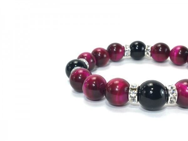 こちらは、12mm玉のピンクタイガーアイとオニキスを使用した天然石ブレスレットです。石との間にはロンデルを挟み高級感を演出しています。シンプルなデザインですのでどんなコーディネートとも合わせ易いブレスレットです。石大きさは12mm玉です。内周約18cmです。気になる方は是非この機会にどうぞ。
