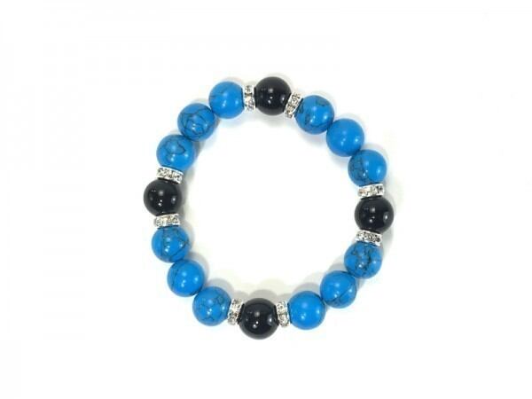 こちらは、12mm玉のターコイズとオニキスを使用したブレスレットです。石との間にはロンデルを挟み高級感を演出しています。シンプルなデザインですのでどんなコーディネートとも合わせ易いブレスレットです。石大きさは12mm玉です。内周約18cmです。気になる方は是非この機会にどうぞ。