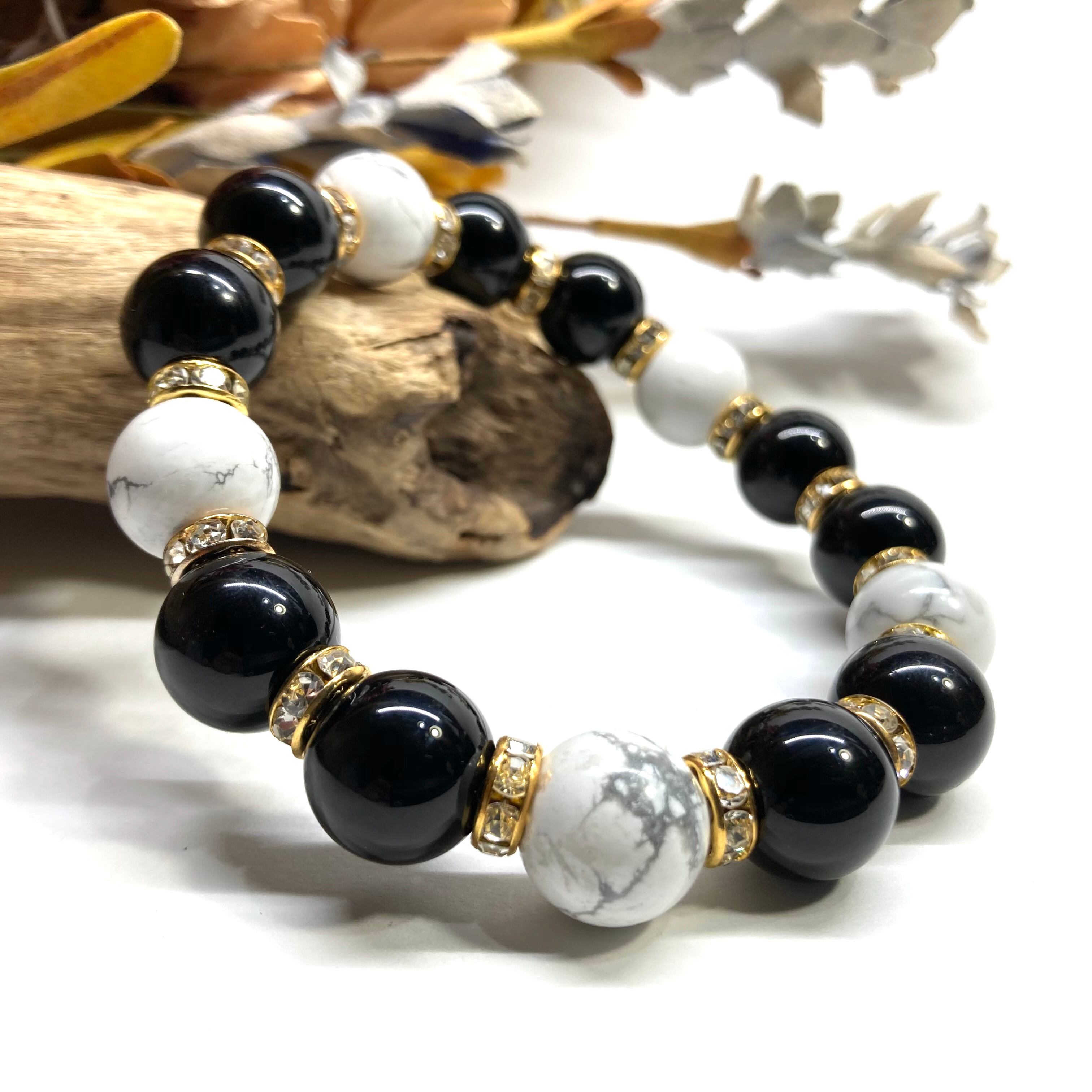こちらは、12mm玉のモリオンとハウライトを組み合わせたパワーストーンブレスレットです。間にはロンデルを挟み高級感あるデザインに仕上げております。石大きさは12mm玉を使用して内周約18cmです。数に限りがございますので気になる方はお早めにどうぞ。