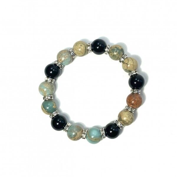 こちらは、インプレッションストーンとオニキスを組み合わせたパワーストーンブレスレットです。間にはロンデルを挟み高級感あるデザインに仕上げております。石大きさは12mm玉を使用して内径約18cmです。気になる方は是非この機会にどうぞ。