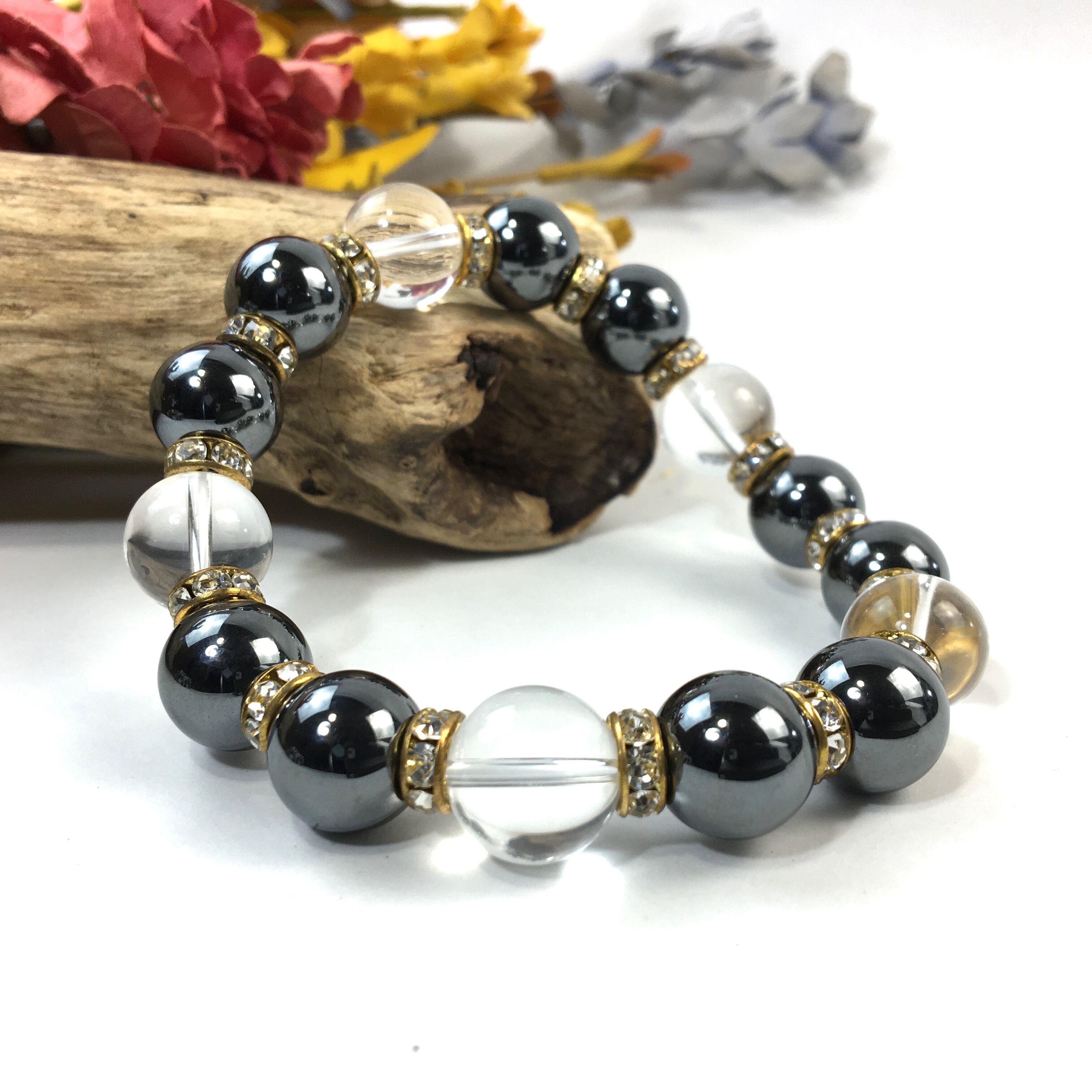 こちらは、ヘマタイトと水晶を組み合わせたパワーストーンブレスレットです。間にはロンデルを挟み高級感あるデザインに仕上げております。石大きさは12mm玉を使用して内周約18cmです。気になる方は是非この機会にどうぞ。