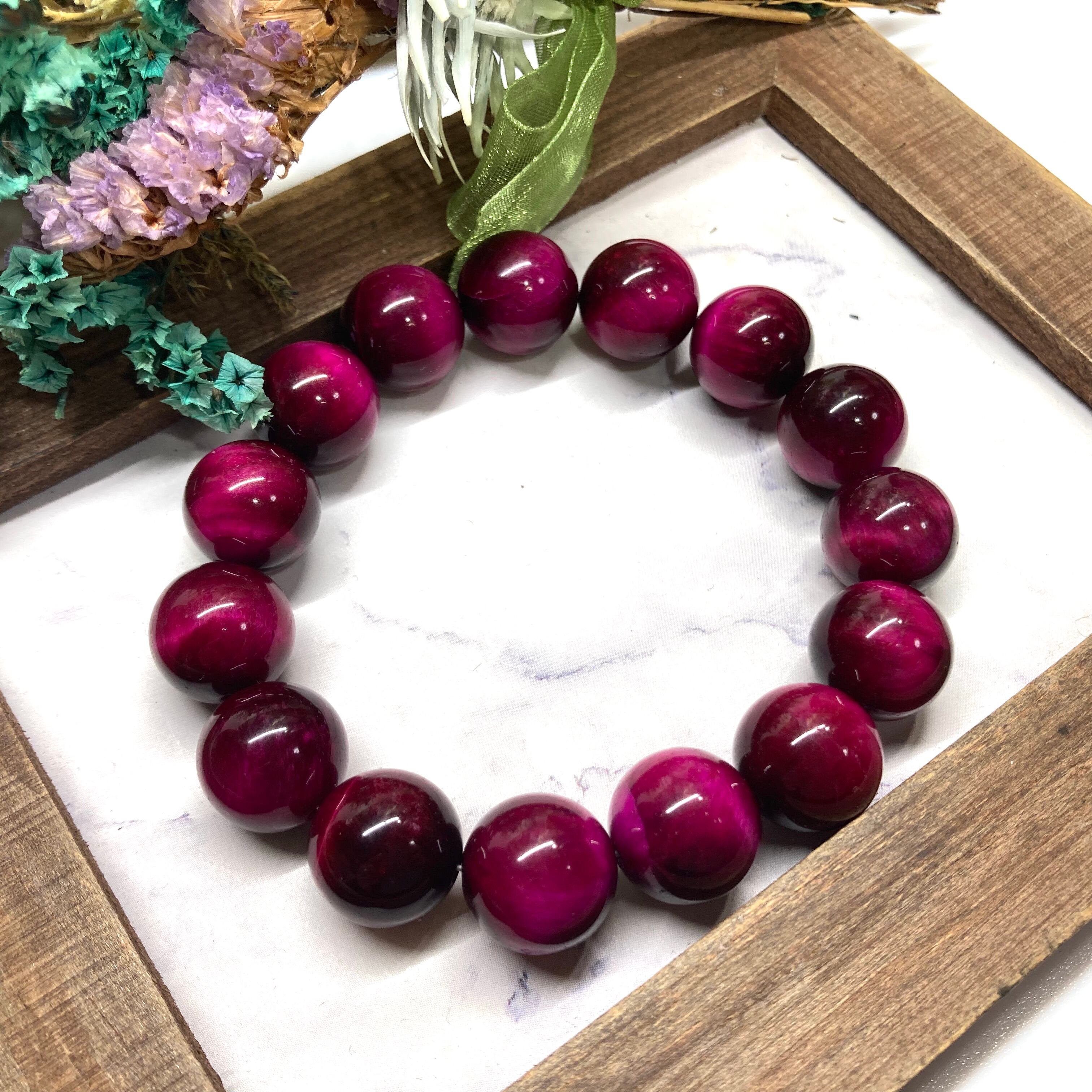 こちらは、14mm玉のピンクタイガーアイを使用したブレスレットです。シンプルなデザインですのでどんなコーディネートとも合わせ易いブレスレットです。石大きさはインパクトを与えてくれる大きさの14mm玉を使用しています。内周約17cmです。数に限りがございますので気になる方はお早めにどうぞ。
