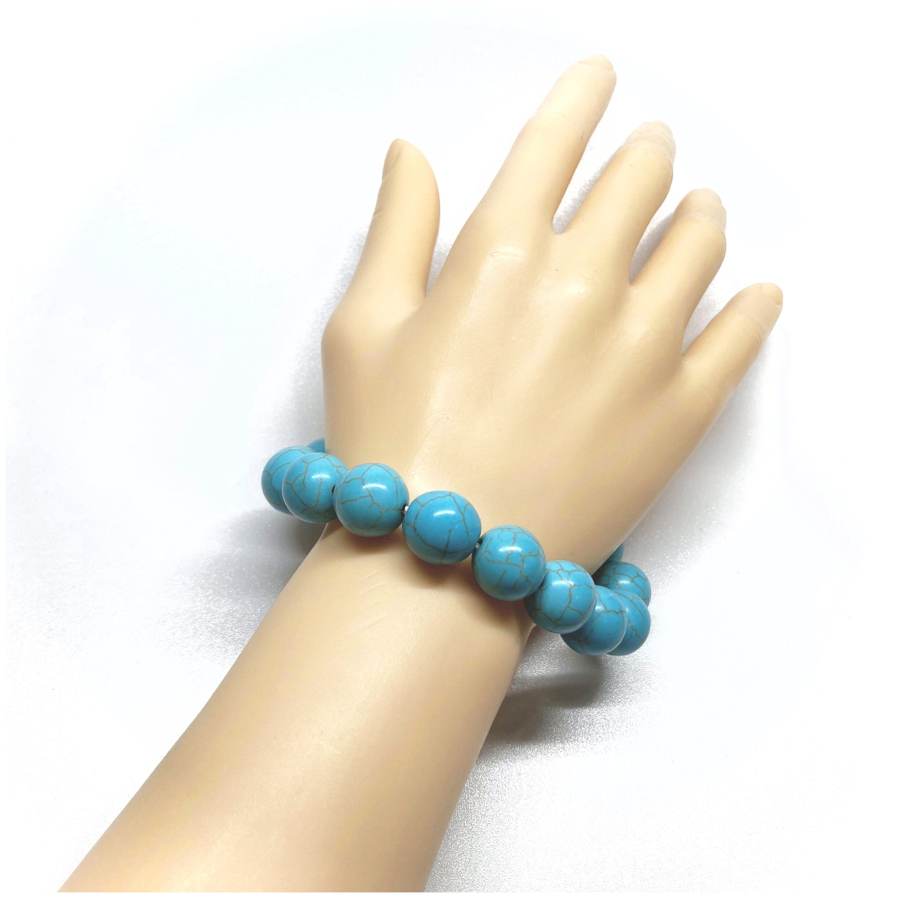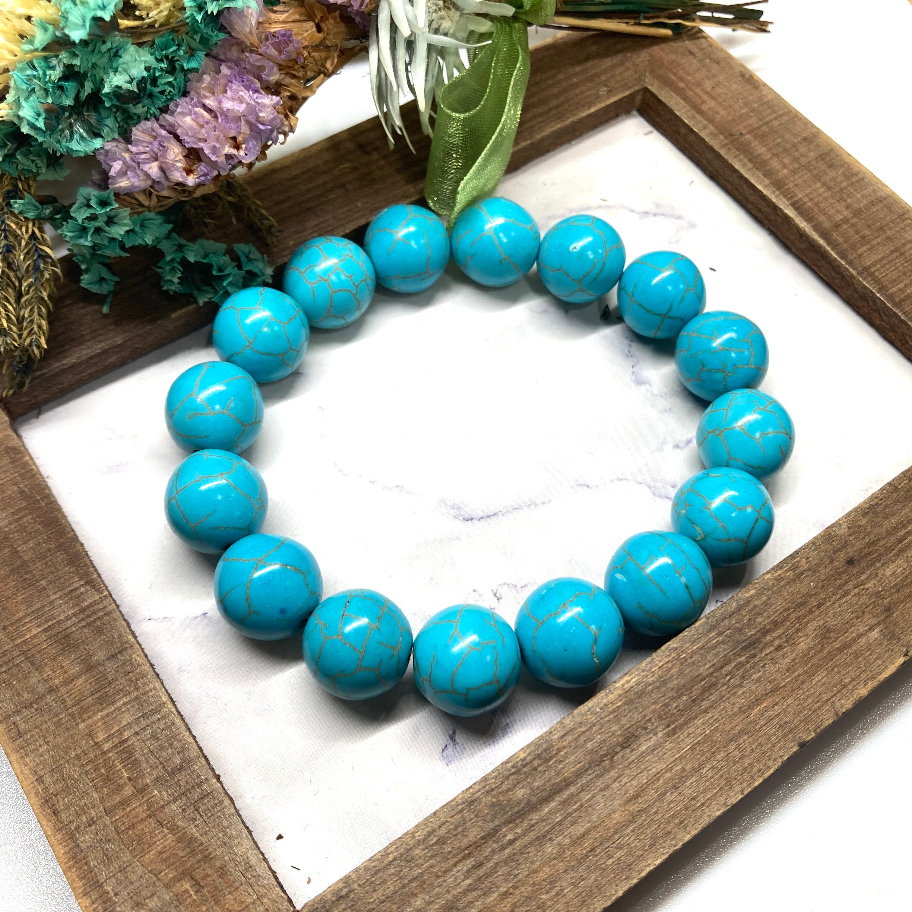 こちらは、14mm玉のターコイズを使用したブレスレットです。シンプルなデザインですのでどんなコーディネートとも合わせ易いブレスレットです。石大きさはインパクトを与えてくれる大きさの14mm玉を使用しています。内周約17cmです。数に限りがございますので気になる方はお早めにどうぞ。