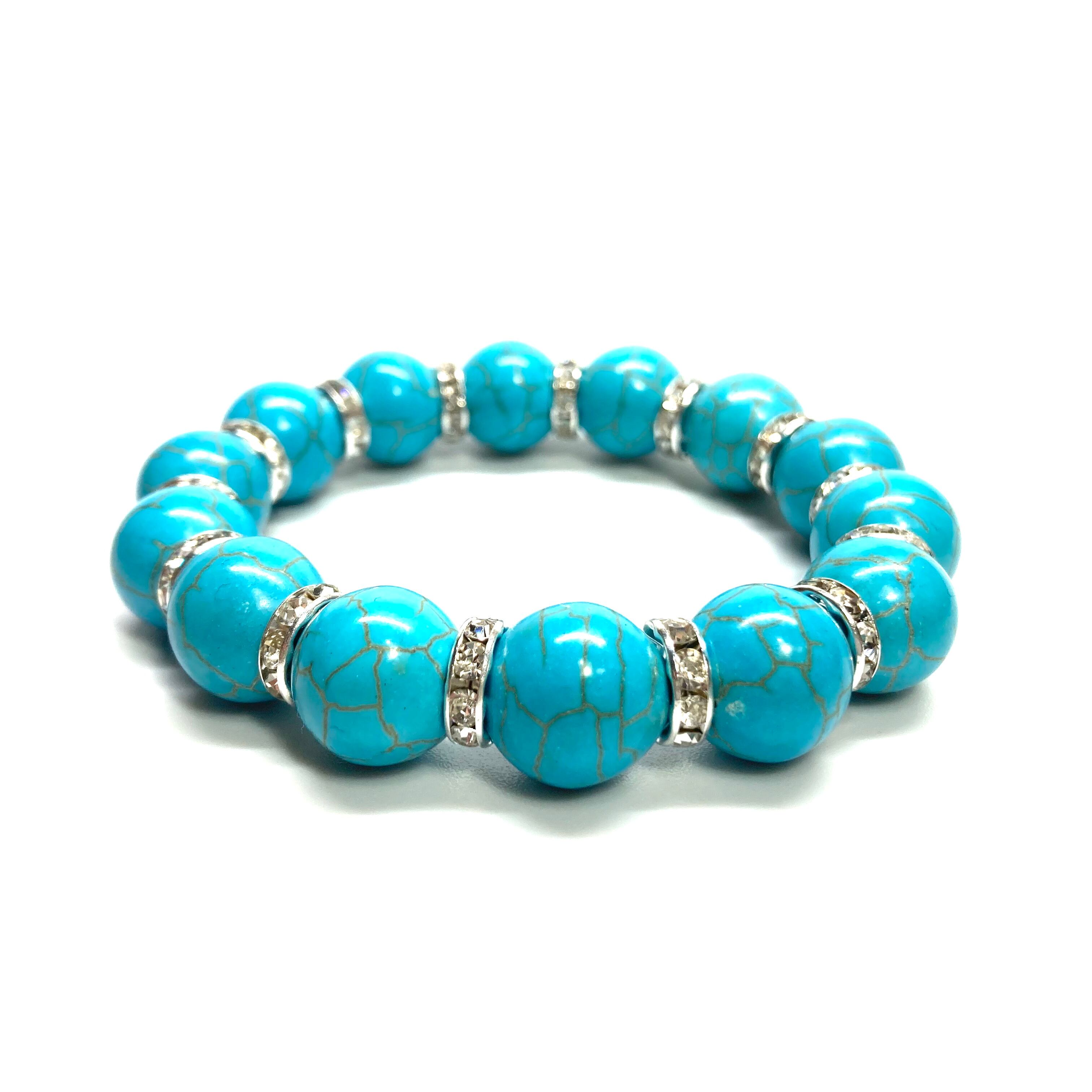 こちらは、14mm玉のターコイズを使用したブレスレットです。シンプルなデザインですのでどんなコーディネートとも合わせ易いブレスレットです。石との間にはロンデルを挟み高級感を演出しています。石大きさはインパクトを与えてくれる大きさの14mm玉を使用しています。内周約17cmです。数に限りがございますので気になる方はお早めにどうぞ。