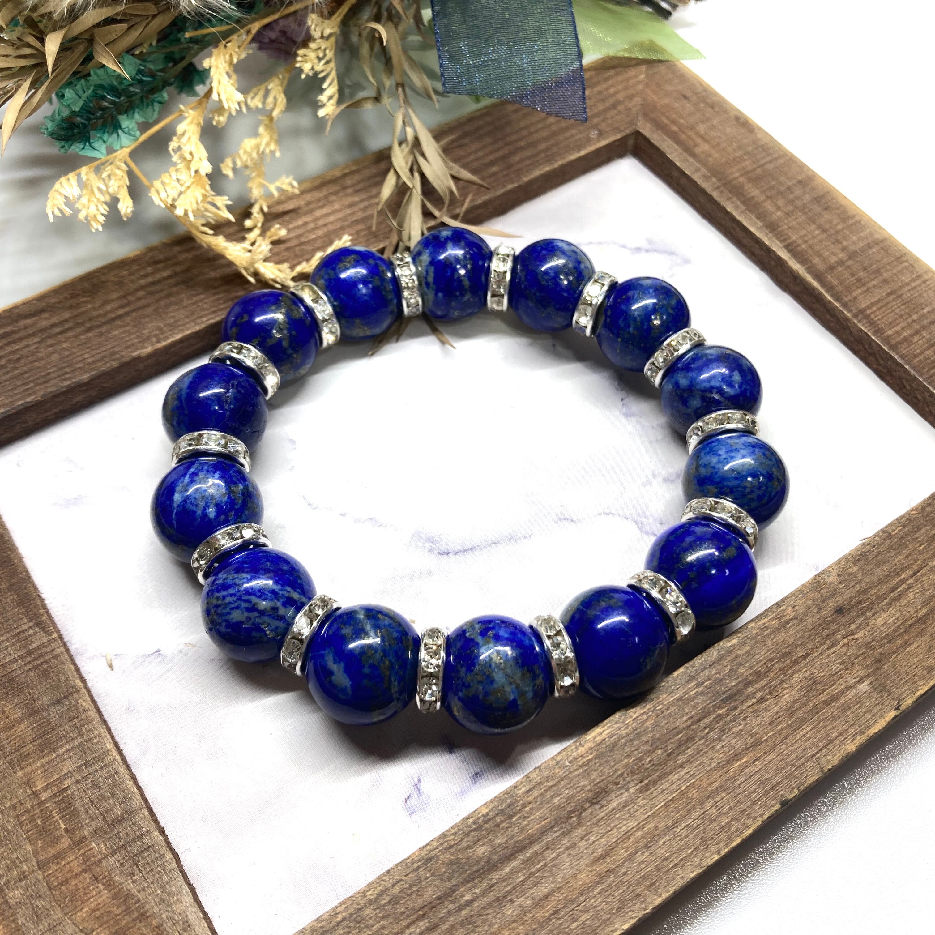 こちらは、14mm玉のラピスラズリを使用した天然石ブレスレットです。シンプルなデザインですのでどんなコーディネートとも合わせ易いブレスレットです。石との間にはロンデルを挟み高級感を演出しています。石大きさはインパクトを与えてくれる大きさの14mm玉を使用しています。内周約17cmです。数に限りがございますので気になる方はお早めにどうぞ。