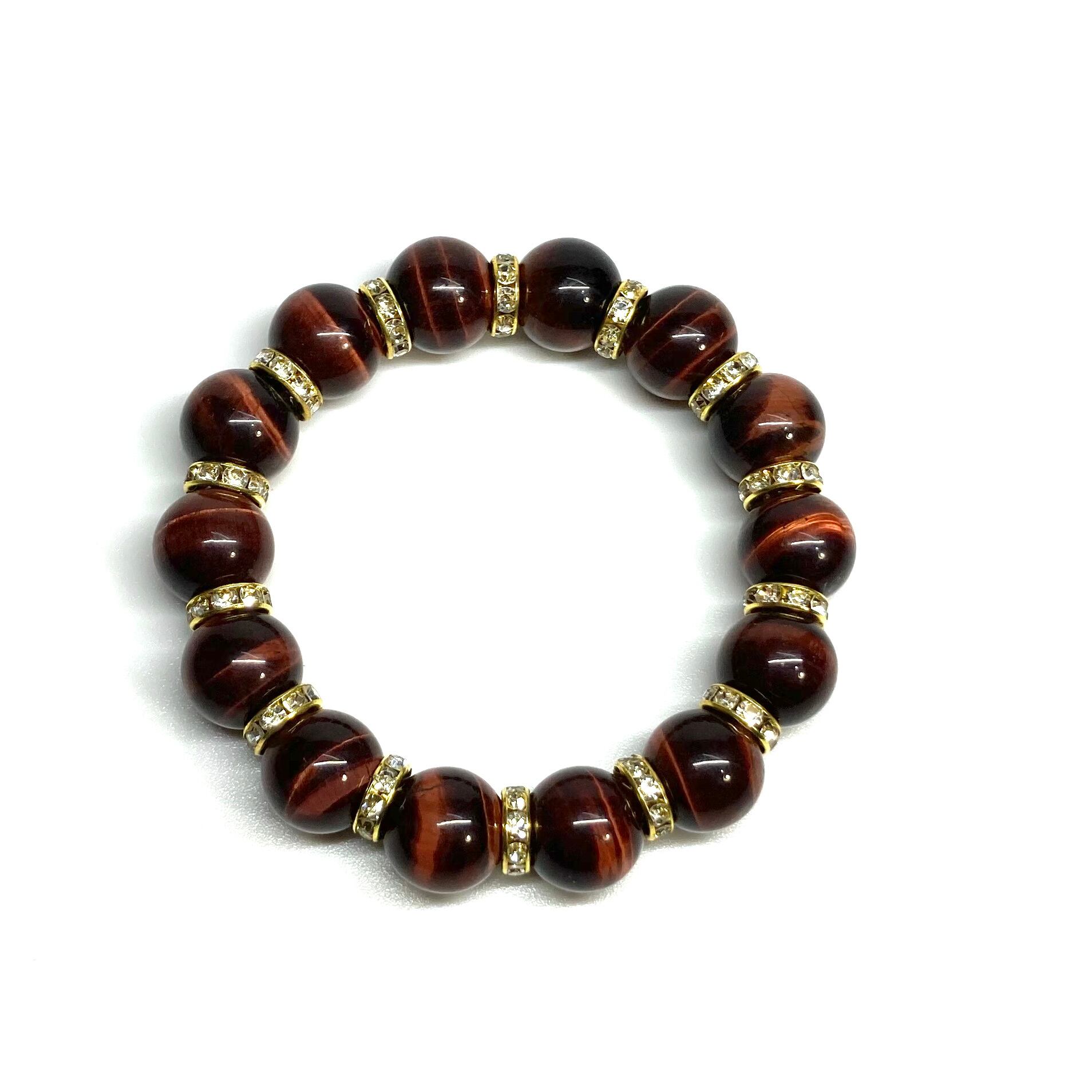 こちらは、14mm玉のレッドタイガーアイを使用した天然石ブレスレットです。シンプルなデザインですのでどんなコーディネートとも合わせ易いブレスレットです。石との間にはロンデルを挟み高級感を演出しています。石大きさはインパクトを与えてくれる大きさの14mm玉を使用しています。内周約17cmです。数に限りがございますので気になる方はお早めにどうぞ。