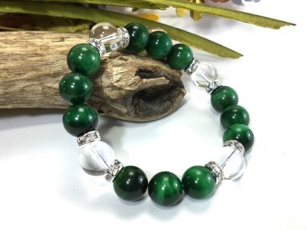 こちらは、12mm玉のグリーンタイガーアイと水晶を使用した天然石ブレスレットです。石との間にはロンデルを挟み高級感を演出しています。シンプルなデザインですのでどんなコーディネートとも合わせ易いブレスレットです。石大きさは12mm玉です。内周約18cmです。気になる方は是非この機会にどうぞ。