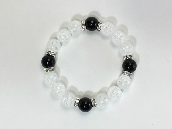 こちらは、12mm玉のクラック水晶 とオニキスを使用した天然石ブレスレットです。石との間にはロンデルを挟み高級感を演出しています。シンプルなデザインですのでどんなコーディネートとも合わせ易いブレスレットです。石大きさは12mm玉です。内周約18cmです。気になる方は是非この機会にどうぞ。