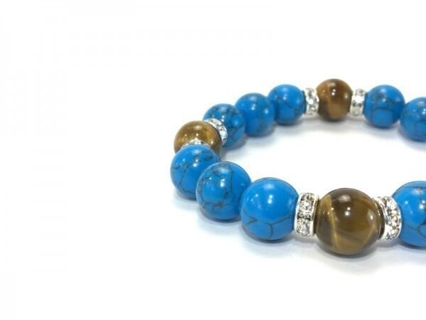 こちらは、12mm玉のターコイズとタイガーアイを使用したブレスレットです。石との間にはロンデルを挟み高級感を演出しています。シンプルなデザインですのでどんなコーディネートとも合わせ易いブレスレットです。石大きさは12mm玉です。内周約18cmです。気になる方は是非この機会にどうぞ。