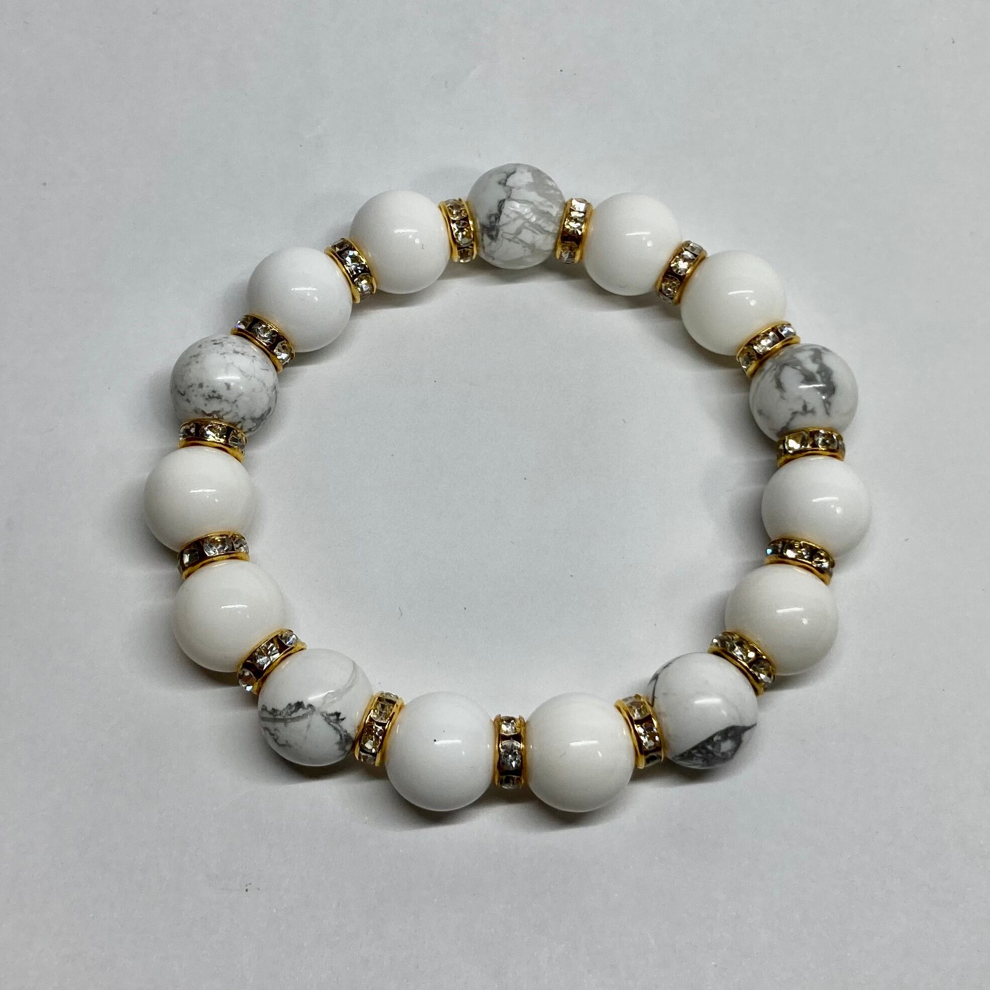 こちらは、ホワイトオニキスとハウライトを組み合わせたパワーストーンブレスレットです。間にはロンデルを挟み高級感あるデザインに仕上げております。程よくインパクトがある12mm玉を使用して内周約18cmです。数に限りがございますので気になる方はお早めにどうぞ。